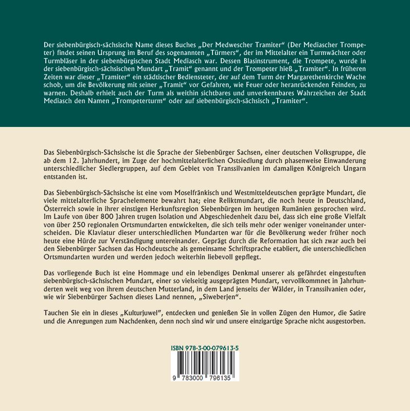 Das Buch „Der Medwescher Tramiter“ war anfangs eine besondere Herausforderung für mich und dürfte es auch für viele andere Leser sein. Das Siebenbürger Sächsisch, meine Muttersprache, die meine Kindheit und Jugend begreifbar und (er)lebbar machte, ist den Angehörigen meiner Generation vorwiegend als gesprochene Sprache vertraut. Als Schriftsprache wurde Hochdeutsch verwendet. Mittlerweile hat sich die Lebenssituation vieler von uns verändert, oft ist in der neuen Heimat das Hochdeutsche zur alleinigen Kommunikationssprache geworden und daher ist das Lesen und Verstehen des schriftlichen „Medwescher Saksesch“ nichts Alltägliches. Die einzigen Leseübungen – oft nicht einfach – waren für mich bisher Texte aus der gleichnamigen Mundartbeilage des „Mediascher Infoblatts“. Und nun ein ganzes Buch!