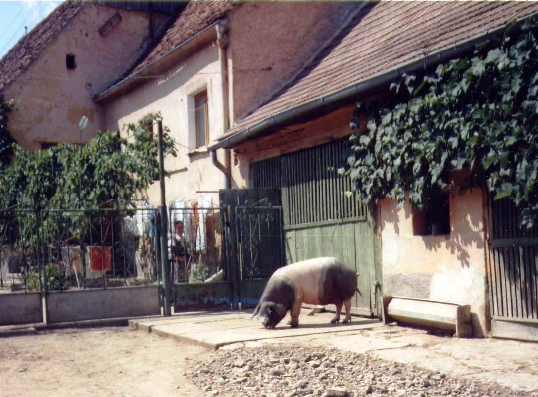2003 Landwirtschaft im Altenheim in Hetzeldorf – auf dem Hof ein Bassener Schwein.