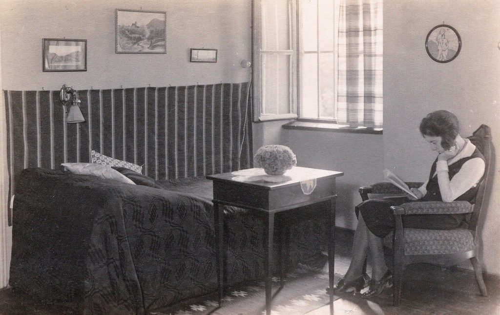 Auguste Fabini lesend am Fenster ihres Zimmers, im Jahr 1931. Die Fotografie wirkt wie eine wohl arrangierte Raumkomposition, strahlt eine besinnlich, ruhige Stimmung aus.