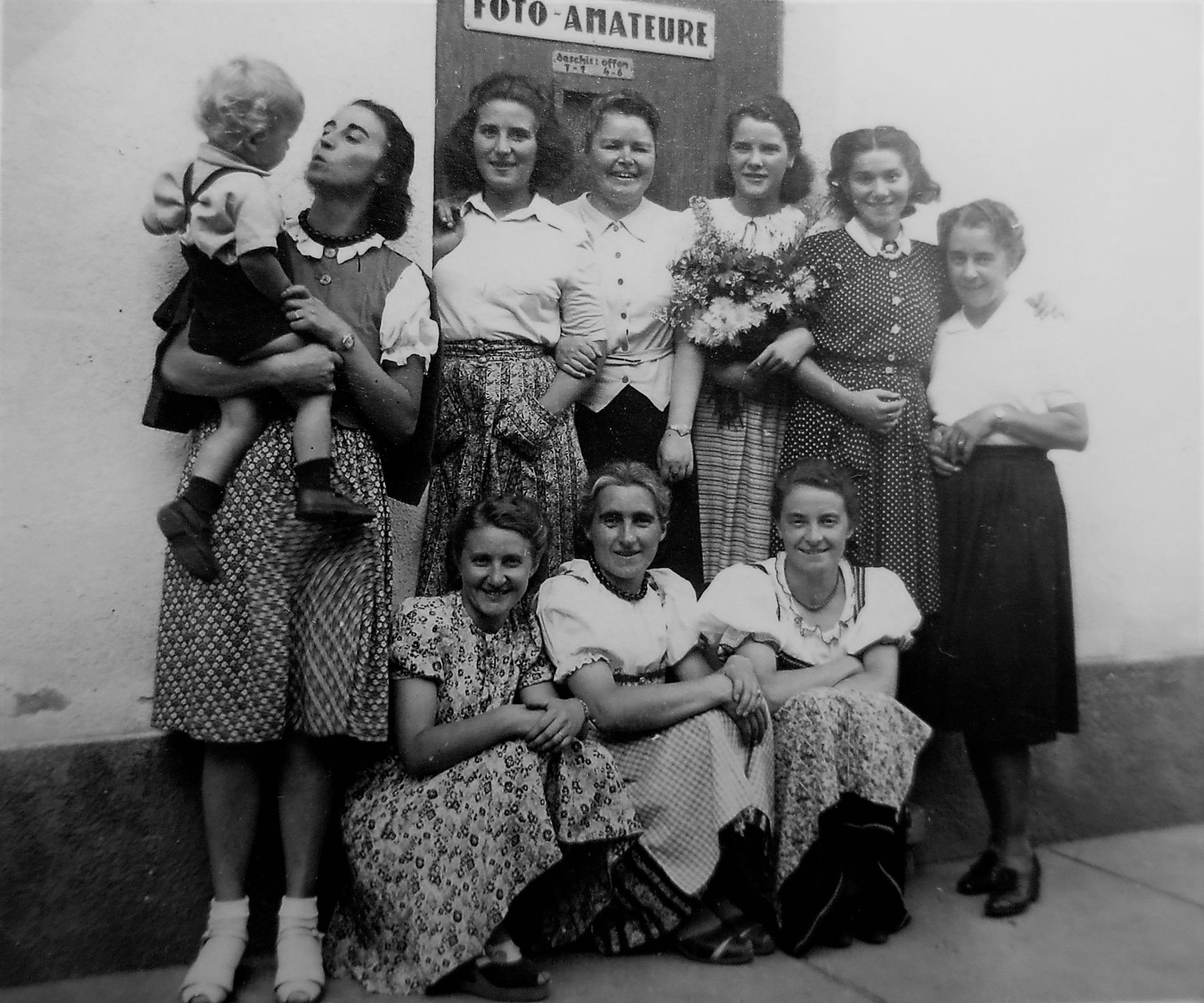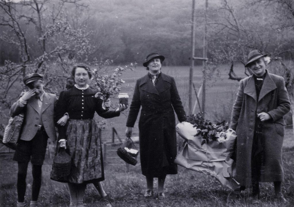 Gratulantinnen nahen mit Geschenken zu Josefine Fabinis (Josi) Geburtstagsfest am 21.April 1939 im Weberln. Mit dabei Freundin Margarete Roth (Pitzi), 2.v.l. und Cousine Josefine Roth (Fini), 3.v.l.