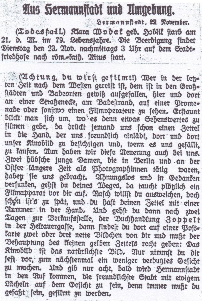 (Achtung, du wirst gefilmt!) Wer in der letzten Zeit nach dem Westen gereist ist, dem ist in den Großstädten und Badeorten gewiss aufgefallen, hier und dort an einer Straßenecke, am Badestrand, auf einer Promenade oder sonstwo einen Filmoperateur zu sehen. Erstaunt blickt man sich um, wo es denn etwas Sehenswertes zu filmen gebe, da drückt jemand uns schon einen Zettel in die Hand, der uns freundlich einlädt, dort und dort unser Kinobild zu besichtigen und, wenn es uns gefällt, zu kaufen. Nun haben wir diese Neuerung auch bei uns. Zwei hübsche junge Damen, die in Berlin und an der Ostsee längere Zeit als Photographinnen tätig waren, haben sie uns gebracht. Ahnungslos und in Gedanken versunken gehst du deines Weges, da taucht plötzlich ein Filmapparat vor Dir auf. Rasch willst du ausweichen, doch schon ist´s zu spät, und du hast deinen Zettel mit der Nummer in der Hand. Und gehst du dann nach zwei Tagen zur Verkaufsstelle, der Buchhandlung Zoppelt in der Heltauergasse, dann findest du dort auf einer Postkarte zwei oder drei nette Bildchen von dir und musst der Behauptung des kleinen gelben Zettels recht geben: Das Kinobild ist das natürlichste Bild. Nur nimmst du dir fest vor, das nächstemal ein weniger verdutztes Gesicht zu machen. Und gib nur acht, bald wird Hermannstadt in den Ruf kommen, die freundlichste Stadt mit ewigem Lächeln auf dem Gesicht zu sein, denn immer musst du gefasst sein, gefilmt zu werden.