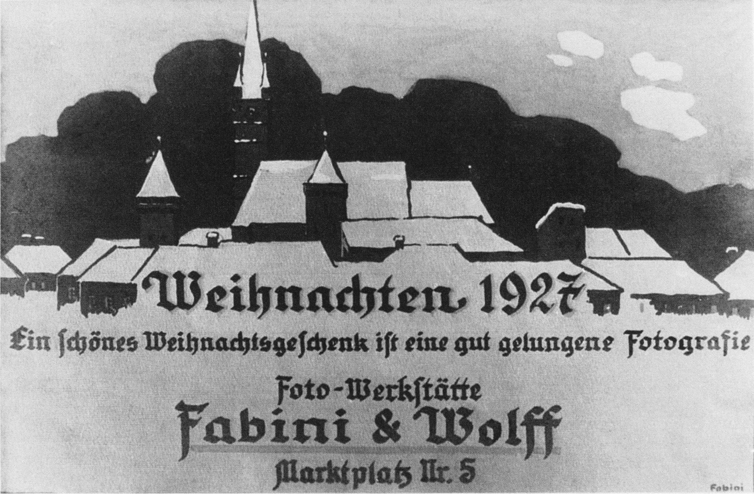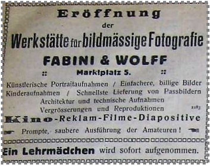 Die Eröffnung des Ateliers wird in der Mediascher Zeitung vom Sonnabend, 29. Oktober 1927 erstmals annonciert: „Eröffnung der Werkstätte für bildmäßige Fotografie. FABINI & WOLFF. Marktplatz. Künstlerische Porträtaufnahmen/ Einfachere, billige Aufnahmen/ Kinderaufnahmen/ Schnellste Lieferung von Passbildern, Architektur und technische Aufnahmen, Vergrößerungen und Reproduktionen, Kino – Reclam – Filme – Diapositive. Prompte, saubere Ausführung der Amateuren. Ein Lehrmädchen wird sofort aufgenommen.“ Ein umfangreicher Leistungskatalog, in dem neben den Profiaufnahmen der Fotografinnen von Beginn an auch Fotoarbeiten für Amateurfotografen angeboten werden, also Filmentwicklung und Fotoabzüge. Unter der Rubrik „Nachrichten vor Orte“, wird mit der kurzen Notiz: „vom 1. November an eröffnet“ das genaue Eröffnungsdatum bekannt gegeben. Eine fast textgleiche Annonce und Notiz wiederholt sich in der Mediascher Zeitung vom 5. November d. J. Und in der Adventszeit 1927 erscheint schließlich eine weitere Annonce mit grafisch gestalteter winterlicher Ansicht des Mediascher Kirchenkastells: „Ein schönes Weihnachtsgeschenk ist eine gut gelungene Fotografie. Foto-Werkstätte Fabini & Wolff. Marktplatz Nr. 5“. Nichts wird versäumt um das neue Atelier bekannt zu machen, so der geschickt gewählte Eröffnungstermin rechtzeitig vor dem Weihnachtsgeschäft und die intensive Bewerbung in der lokalen Presse. Die beiden Fotografinnen agieren professionell. Und soweit überliefert, scheint das Atelier von Beginn an auch gut zu laufen.