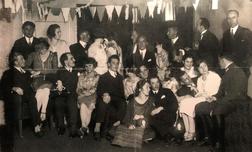 Fröhliche Geburtstagsrunde im Weberl zu Josefine Roths (Fini) Geburtstag am 10. April 1939. Josefine Roth (Cousine der Fabinischwestern) in der Mitte mit Blumenränzchen geschmückt.