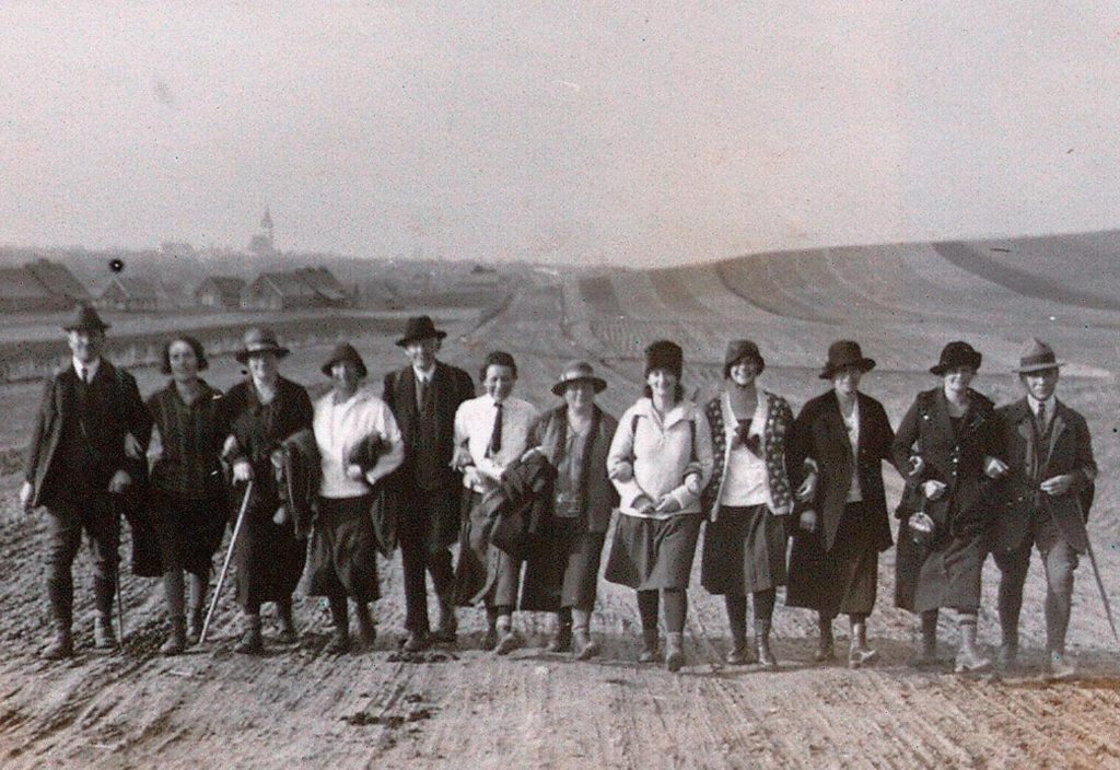 Fröhliche Wanderung mit Freunden bei Großau, im Januar 1927, nach Art der „Film-Geh-Aufnahmen“.