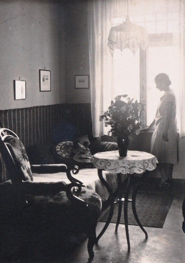 Josefine Fabini (Josi) am Fenster ihres Zimmers in Kronstadt 1927. Rauminszenierung mit Gegenlicht, ein Motiv das in Auguste Fabinis Fotografien öfter auftaucht.