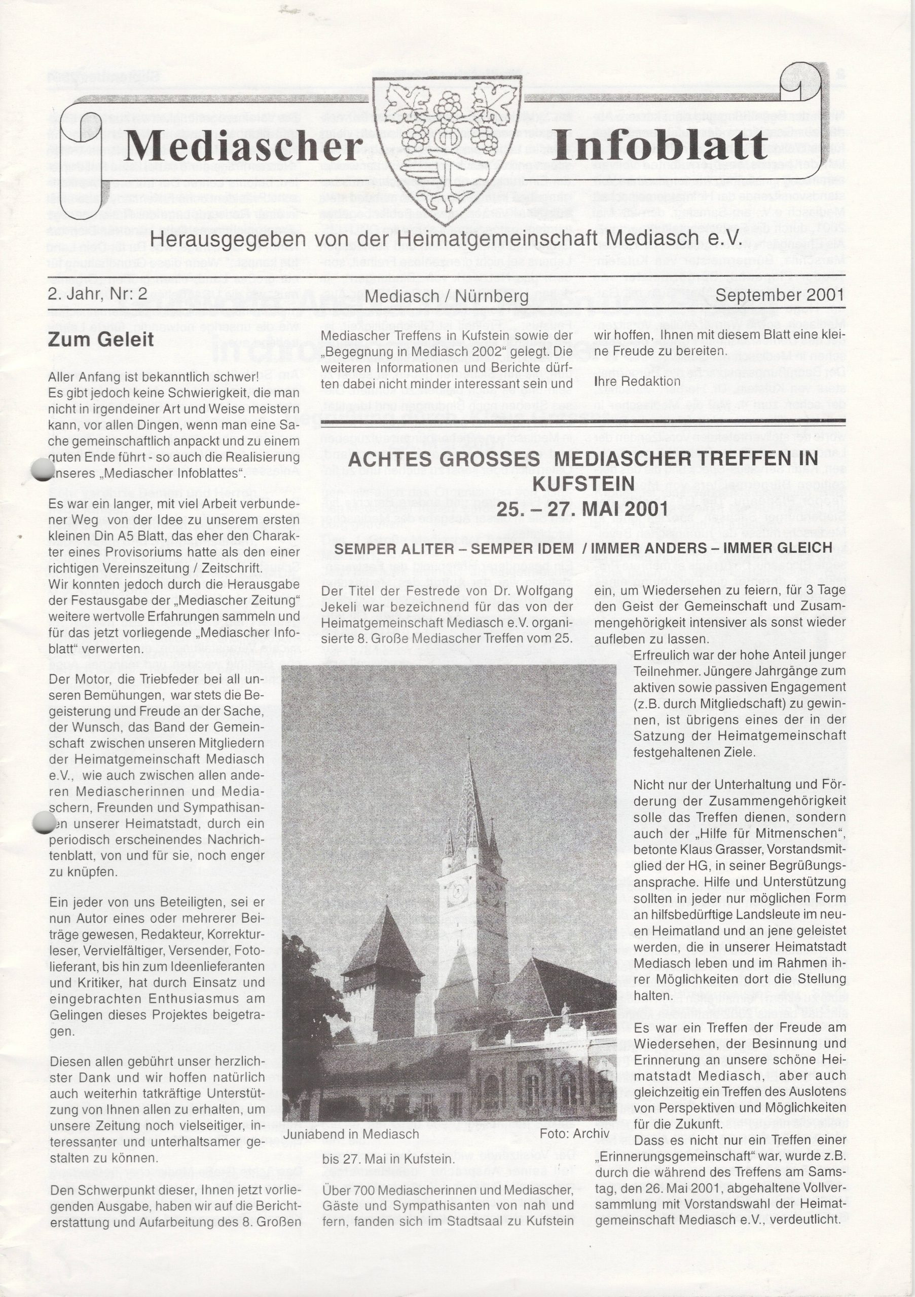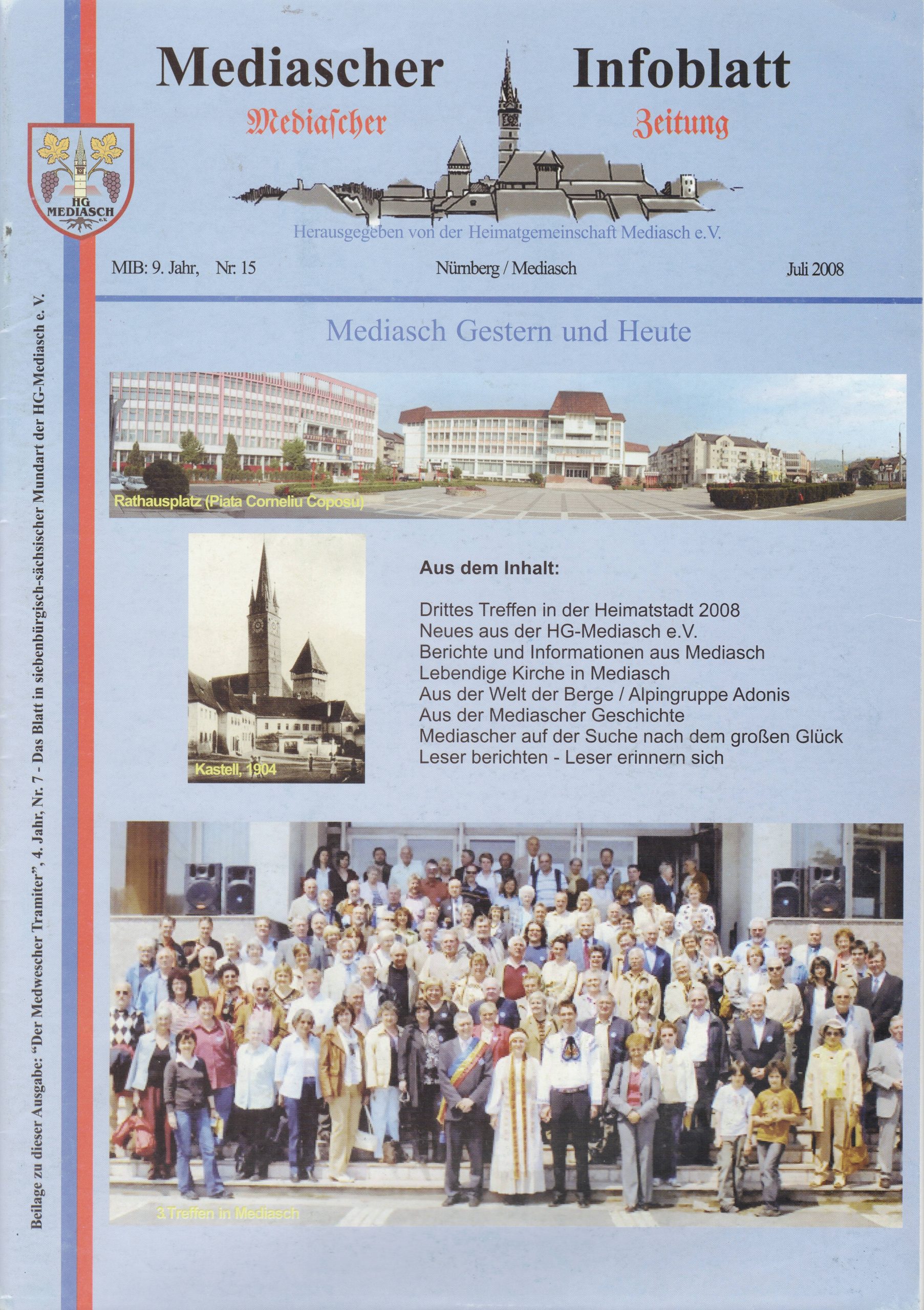 Wir hoffen, dass dies nicht nur für das Redaktionsteam, sondern auch für die Mitglieder der Heimatgemeinschaft Mediasch und alle anderen Freunde unserer Heimatstadt ein Grund zu feiern ist. Vor 25 Jahren kam das erste „Mediascher Infoblatt“ heraus. Zwar durften die Teilnehmer am Großen Mediascher Treffen in Kufstein schon seit 1981 alle drei Jahre eine „Mediascher Zeitung“ in den Händen halten, mit Nachrichten aus der Heimat mit Erinnerungen an die sächsische Gemeinschaft in Alt-Mediasch.
