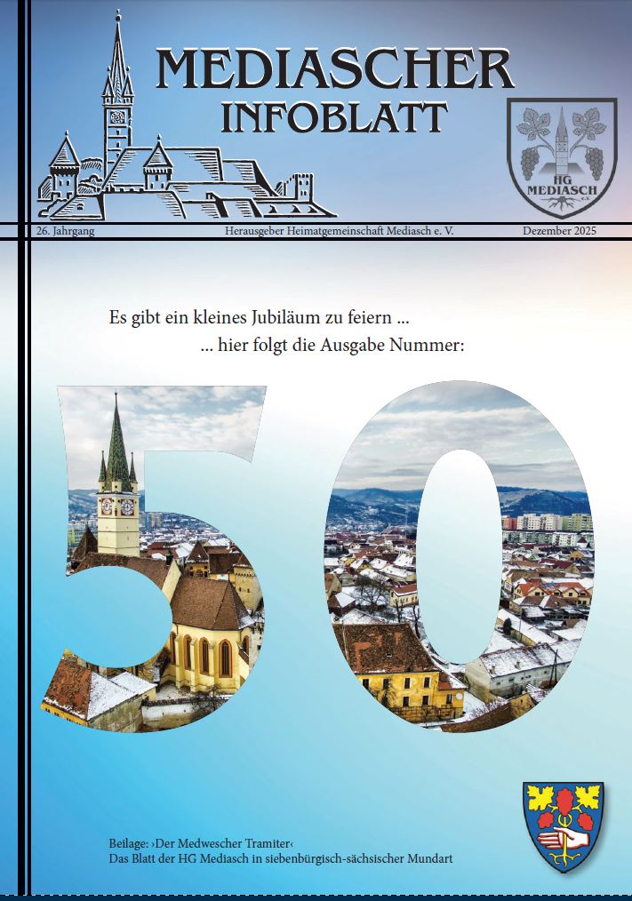Die Redaktion von „Mediascher Infoblatt“ und „Medwescher Tramiter“ darf sich über ein neues doppeltes Jubiläum freuen. Im Sommer dieses Jahres hatten wir uns schon über 20 Jahre seit dem Erscheinen des ersten „Medwescher Tramiters“ freuen dürfen und hatten aus Anlass dieses Jubiläums einen stattlichen Band mit dem Titel „Der Medwescher Tramiter“ veröffentlicht. Nun stellt die Heimatgemeinschaft ihren Leserinnen und Lesern im Dezember 2025 das 50. Heft des „Mediascher Infoblatt“ zu!